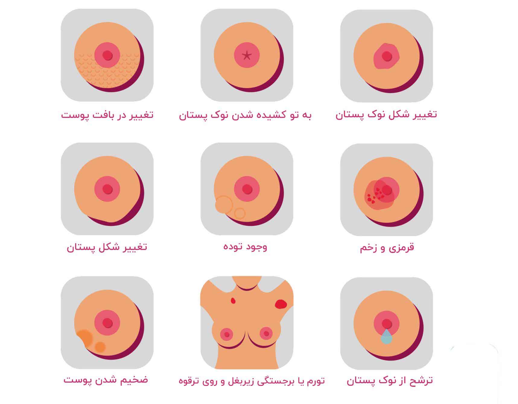 هر گونه قرمزی یا فرورفتگی های کوچک در پوست پستان می تواند نشان دهنده ی وجود بیماری سرطان سینه باشد. هر گونه تغییر در شکل یا بافت سینه ها باید مورد بررسی بیشتر قرار بگیرد.