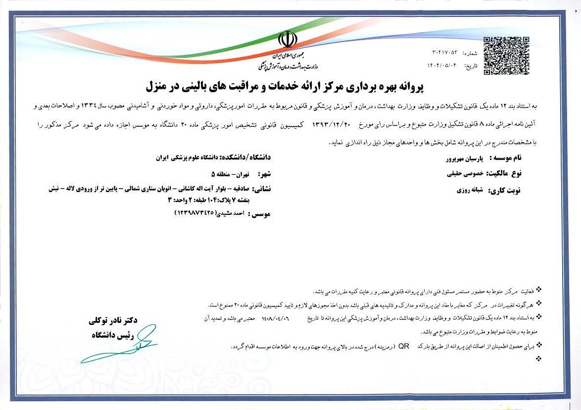 مرکز خدمات پرستاری مهرپرور دارای مجوز رسمی ارائه خدمات پرستاری در منزل از دانشگاه علوم پزشکی مربوطه بوده و تحت نظارت وزارت بهداشت، درمان و آموزش پزشکی فعالیت می‌کند.